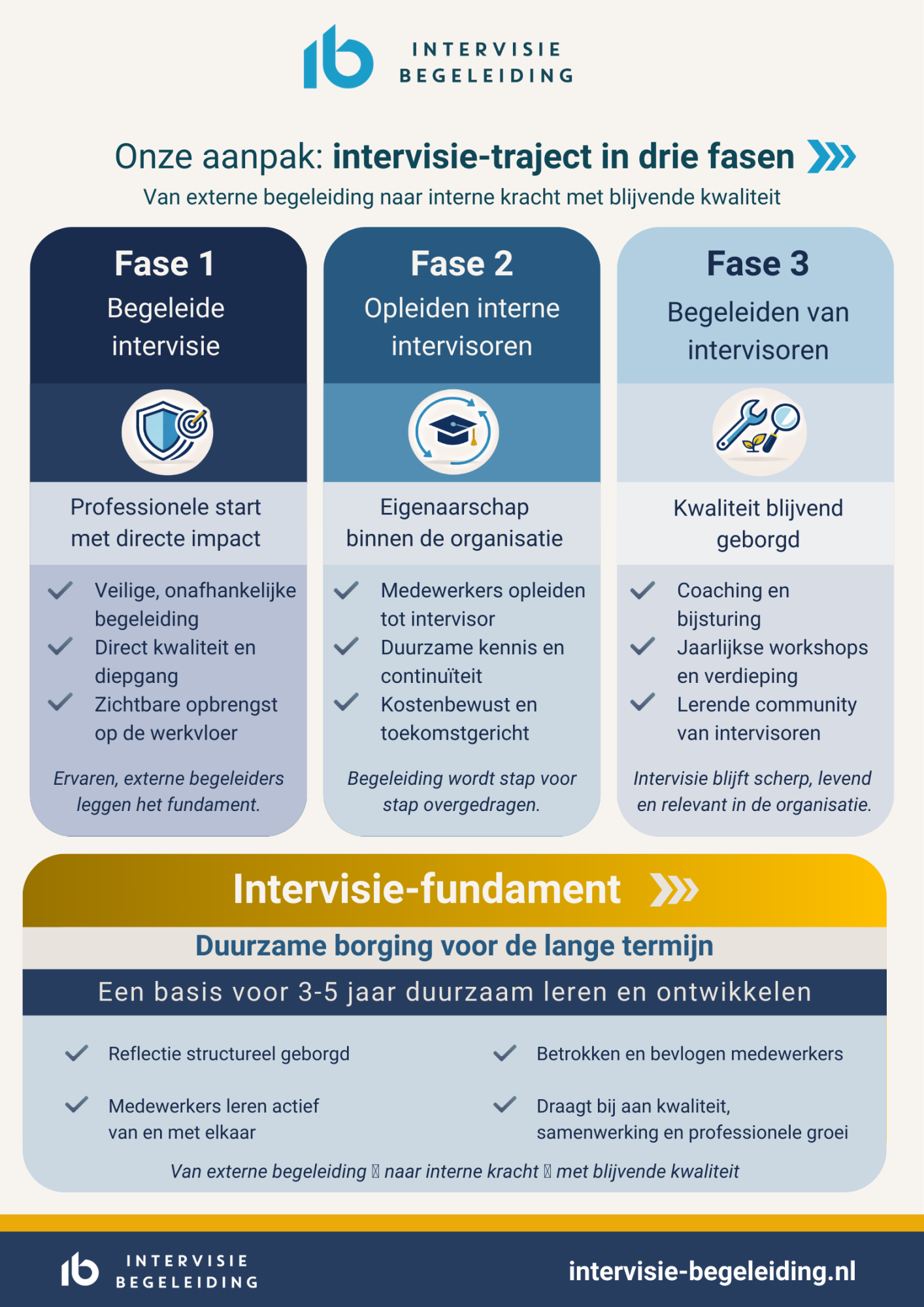 De reflectiecyclus wordt volledig geïntegreerd in de organisatie, zodat het écht gaat leven en blijft leven. En loop je later tegen vragen of uitdagingen aan? Dan blijven we op de achtergrond beschikbaar om mee te denken en te ondersteunen.